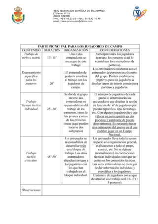 Este documento describe la estructura típica de una sesión de entrenamiento de balonmano, incluyendo una explicación de los contenidos, calentamiento, parte principal dividida por puestos, vuelta a la calma y evaluación. La parte principal dura entre 100-105 minutos e incluye entrenamiento individualizado por puestos y colectivo. Se proporcionan detalles sobre la organización, duración y consideraciones para cada parte de la sesión.