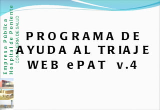 El documento describe el programa de triaje estructurado ePAT, basado en el Modelo Andorrano de Triaje (MAT) y la Escala Canadiense. El programa clasifica a los pacientes en 5 niveles de prioridad dependiendo de sus síntomas y signos vitales, y provee recomendaciones para asegurar que los pacientes más urgentes sean atendidos primero. El objetivo del programa ePAT es proveer una herramienta de apoyo a la decisión clínica durante el proceso de triaje para mejorar la calidad y soporte legal de los profesionales.