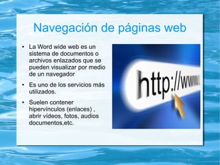 El documento describe los principales servicios de Internet, incluyendo la navegación web, los buscadores, el correo electrónico, los foros, la mensajería instantánea, la voz sobre IP, la videoconferencia y otros servicios como el comercio electrónico, la búsqueda de empleo, la administración electrónica y la formación a distancia. Explica brevemente cómo funcionan cada uno de estos servicios y proporciona ejemplos de aplicaciones y sitios web populares.