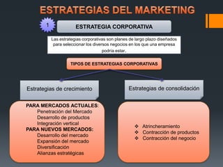 El documento presenta una descripción general de las estrategias corporativas, de mezcla de productos y competitivas. Explica los tipos de estrategias corporativas como de crecimiento y consolidación para mercados actuales y nuevos. También describe los conceptos del ciclo de vida del producto y la matriz de crecimiento para el desarrollo de estrategias de mezcla de productos. Finalmente, resume las tres opciones básicas para diseñar la estrategia competitiva de una empresa.