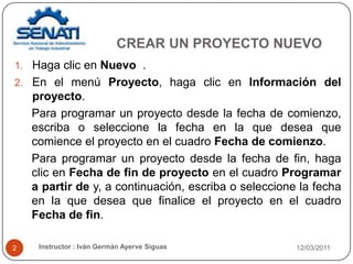 Este documento proporciona instrucciones sobre cómo crear y administrar tareas y proyectos en Microsoft Project. Explica cómo crear un nuevo proyecto, agregar tareas, eliminar tareas, crear tareas repetitivas, y agrupar tareas. También describe las características de la ventana de información del proyecto como la fecha de inicio, fecha de finalización, y calendario.