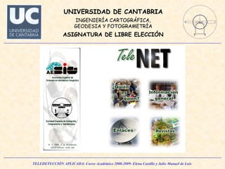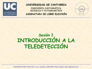 Este documento presenta una introducción a la teledetección. Explica que la teledetección involucra la medición de la radiación electromagnética emitida por objetos sin contacto físico. Detalla la evolución histórica de la teledetección desde las primeras fotografías aéreas hasta los satélites modernos. Finalmente, describe algunos campos de aplicación como la cartografía, agricultura y medio ambiente, e incluye ejemplos de sensores e información sobre distribución de imágenes.