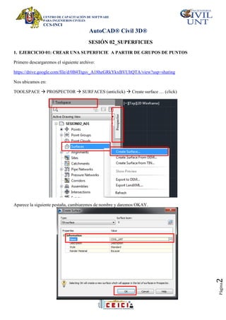 Este documento presenta un manual sobre el uso de AutoCAD Civil 3D. Explica cómo crear y editar superficies a partir de puntos, cómo aplicar estilos de triangulación y curvas de nivel, y cómo realizar análisis de superficies como direcciones, elevaciones, pendientes y cuencas. También muestra cómo generar tablas dinámicas con datos de análisis de superficies.