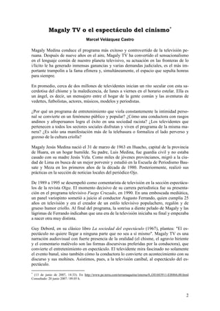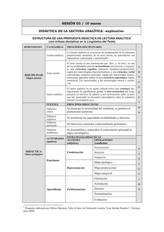 El documento aborda temas de didáctica de la lectura analítica, el fenómeno mediático de 'Magaly TV', y la música popular representada por el grupo 'Néctar', explorando cómo estos elementos reflejan aspectos culturales y sociales en la sociedad peruana. Se examina la construcción de significados en la lectura analítica, el sensacionalismo en la televisión y el impacto de la música cumbia en la identidad migrante. Además, se discute el machismo y su relación con la liberación femenina, sugiriendo que la verdadera emancipación requiere que los hombres también se liberen de estereotipos de género.