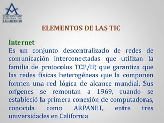 El documento describe los orígenes e historia de Internet. Comenzó en 1969 como ARPANET, una red entre universidades en California, y creció con la introducción de la World Wide Web en los años 90. Explica elementos clave como protocolos TCP/IP, correo electrónico, transferencia de archivos y otros servicios. También resume hitos históricos importantes entre 1969 y 2006 que llevaron al crecimiento de Internet a nivel mundial.