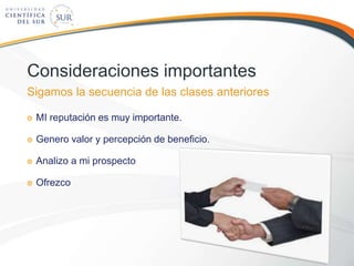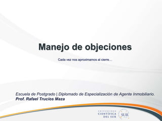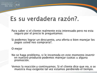 El documento presenta información sobre el manejo de objeciones en el proceso de ventas. Explica que las objeciones son oportunidades para conocer mejor las necesidades del cliente y resolver dudas. Además, recomienda escuchar activamente las objeciones del cliente para descubrir las preguntas ocultas detrás de ellas y así poder responder de manera efectiva. Finalmente, enfatiza la importancia de estar preparado para manejar diferentes tipos de objeciones a través de la práctica y el aprendizaje continuo.