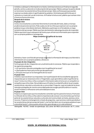 Este documento resume una sesión de aprendizaje sobre los peligros naturales que existen en la localidad y cómo deben protegerse los estudiantes ante ellos. El propósito es que los estudiantes conozcan los peligros naturales como terremotos, inundaciones y huaycos que pueden ocurrir, y aprendan medidas de prevención y protección como conocer las zonas seguras y participar en simulacros. Durante la sesión, los estudiantes analizaron imágenes de diferentes peligros naturales y completaron un cuadro sobre qué hacer en