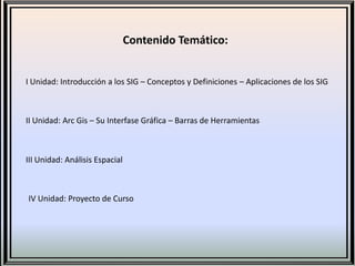 Este documento presenta la asignatura Sistemas de Información Geográfico impartida por el Ingeniero Noel Antonio Pavón L. En la Universidad Nacional de Ingeniería. Incluye el contenido temático organizado en 4 unidades que cubren conceptos básicos de SIG, ArcGIS, análisis espacial y un proyecto de curso. Además, detalla la forma de evaluación que consta de 3 parciales y trabajos sistemáticos.