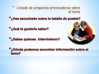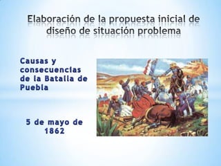 Este documento propone una situación problema sobre la Batalla de Puebla el 5 de mayo de 1862. Incluye una lista de preguntas provocadoras sobre el tema, conceptos centrales como la Segunda Intervención Francesa, el Ejército Francés e Ignacio Zaragoza. También incluye recursos de investigación como Wikipedia, un libro y un sitio web sobre la batalla. Finalmente, propone dividir a los estudiantes en equipos para investigar el tema, integrar lo aprendido y presentarlo en un cuadro con las causas y consec