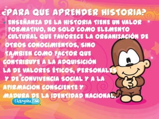 Este documento discute los métodos para enseñar historia de manera efectiva. Explica que la enseñanza de la historia tiene un valor formativo al contribuir a la adquisición de valores éticos y de identidad nacional. También permite comprender la evolución de las sociedades a través del tiempo. Se mencionan métodos como subrayar ideas principales, lluvia de ideas, mapas conceptuales y líneas de tiempo para involucrar a los estudiantes de manera activa en su aprendizaje.