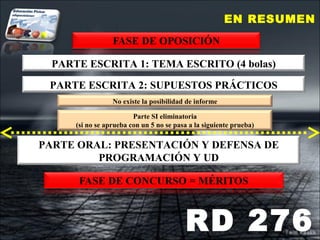 Este documento proporciona información sobre la preparación de las oposiciones para acceder al cuerpo de profesores de enseñanza secundaria de educación física. Explica que la parte escrita consta de dos partes: un tema escrito y supuestos prácticos. También incluye una parte oral de presentación y defensa de la programación didáctica y una unidad didáctica. El documento ofrece consejos sobre cómo diseñar y estudiar los temas y organizarse para la preparación de las oposiciones.