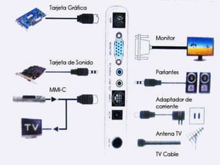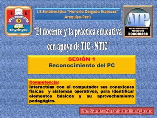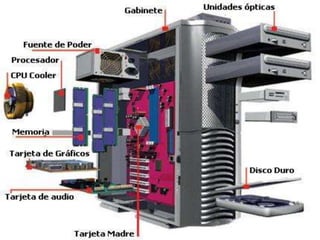 Este documento describe cómo se evalúa el uso de las tecnologías de la información y la comunicación (TIC) en una escuela. Se evalúa el tiempo de uso de las TIC, su influencia en los estudiantes, la eficacia de la capacitación docente, y las actividades de aprovechamiento educativo de las TIC. También explica los componentes básicos del hardware como la CPU, monitor y teclado, y diferentes tipos de software como sistemas operativos y programas de ofimática.
