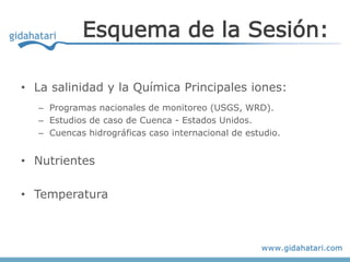 Este documento presenta tres estudios de caso de cuencas hidrográficas y sus programas de monitoreo de la calidad del agua. El primer estudio analiza la cuenca del río Yampa en Colorado y Wyoming, incluidos los perfiles de temperatura y conductividad específica. El segundo examina la cuenca superior de Clear Creek en Colorado, con un enfoque en las variaciones estacionales y anuales de fósforo total y conductividad. El tercer estudio analiza los errores en los valores anuales promedio debido a diferentes frecuencias de