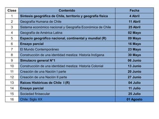 Este documento presenta el plan de estudios de un curso de Historia de América Latina Contemporánea que incluye temas como la geografía de Chile y América Latina, la historia indígena y colonial, la creación de las naciones, la Guerra Fría, y las dictaduras militares en Latinoamérica. El cronograma contiene 30 clases con fechas que van desde abril hasta noviembre y cubren estas áreas a través de lecciones, exámenes parciales y simulacros generales.