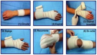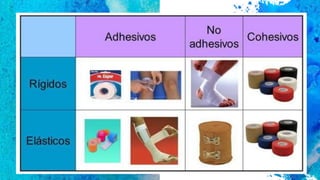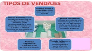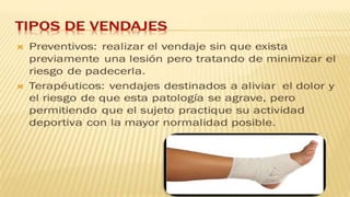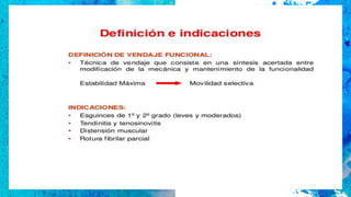 Este documento describe el vendaje funcional, que permite cierta movilidad de las estructuras no afectadas mientras limita los movimientos dolorosos. Explica que el vendaje funcional se usa de forma preventiva o terapéutica para condiciones como distensiones ligamentosas leves, roturas musculares, tendinitis y fracturas óseas. Finalmente, detalla los materiales comúnmente usados como vendas elásticas, inelásticas y mixtas, así como recomendaciones para su aplicación correcta.