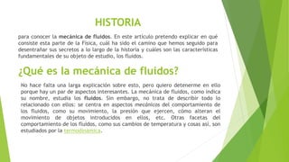 La mecánica de fluidos estudia el comportamiento mecánico de los fluidos como su movimiento y las presiones que ejercen. Un fluido es un medio capaz de fluir y cambiar su forma libremente, incluyendo líquidos, gases y plasmas. La mecánica de fluidos incluye el estudio de fluidos en reposo (estática de fluidos) y en movimiento (dinámica de fluidos), y tiene aplicaciones importantes en ingeniería como en sistemas de combustible de vehículos.