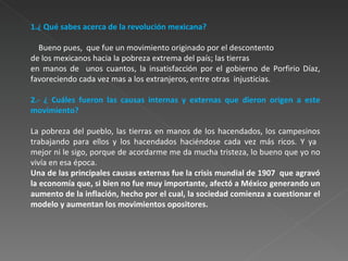 Este documento presenta un resumen de una entrevista realizada a Ma. Esther Chávez Campos sobre la Revolución Mexicana. La entrevistada habla sobre las causas de la revolución como la pobreza, la concentración de tierras y la insatisfacción con el gobierno de Porfirio Díaz. También comenta sobre los logros del movimiento como los derechos de las mujeres y mejoras en las condiciones de vida.