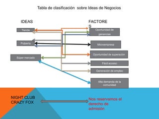 La tabla clasifica ideas de negocios como tienda, pulpería y supermercado según factores como oportunidad de ganancias, ser una microempresa, oportunidad de superación, fácil acceso, generación de empleo y alta demanda de la comunidad. La idea de pulpería se destaca por su enfoque en atención al cliente, habilidades, motivación, comunidad, idea de negocio propio y venta de artículos escolares.