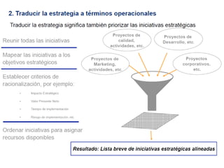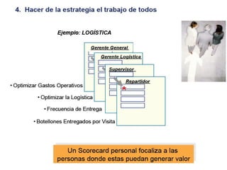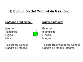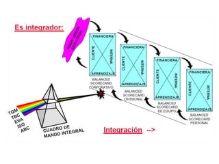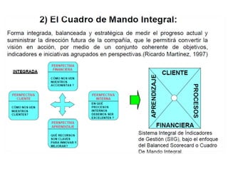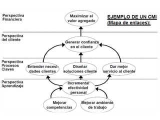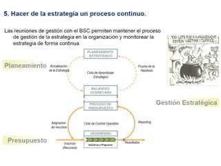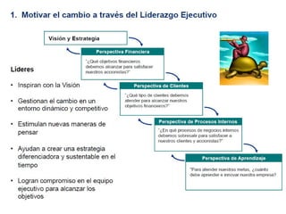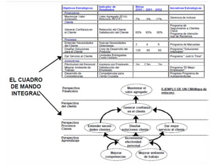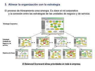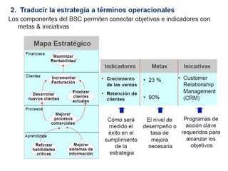 El documento presenta una introducción al Balanced Scorecard (BSC) como herramienta de gestión estratégica. Explica que el BSC identifica objetivos en cuatro perspectivas clave y permite una profunda comprensión de la estrategia mediante la relación causa-efecto entre objetivos. También describe los componentes clave del BSC como el mapa estratégico, la tabla balanceada y el mapa de iniciativas.