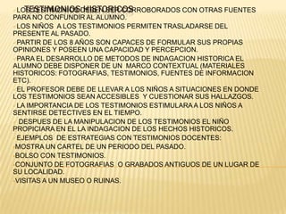 El documento describe estrategias para enseñar historia utilizando testimonios. Señala que los testimonios deben corroborarse con otras fuentes y que los niños mayores de 8 años pueden formular sus propias opiniones sobre los testimonios. Recomienda que los profesores lleven a los estudiantes a situaciones donde puedan acceder a testimonios y cuestionar sus hallazgos para estimularlos a sentirse como detectives del tiempo. También proporciona ejemplos como mostrar carteles de épocas pasadas o visitar museos.