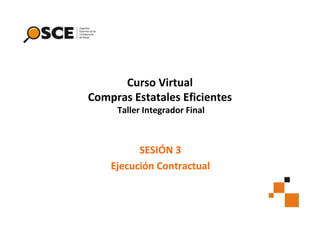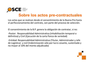 1) El documento describe el proceso de ejecución contractual en las compras estatales, incluyendo la suscripción del contrato, causales de resolución, penalidades y solución de controversias. 2) Se especifican los requisitos para la suscripción del contrato por el postor ganador como la presentación de garantías y documentación requerida. 3) También se explican conceptos como subcontratación, ampliación de plazos, modificaciones y terminación del contrato.