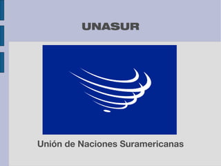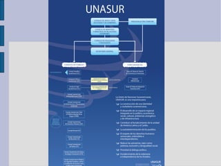 UNASUR es una organización internacional formada por 12 países sudamericanos cuyo objetivo es construir una identidad y ciudadanía suramericanas e integrar la región en lo político, económico, social y cultural. Fue creada en 2008 para profundizar la unión entre las naciones suramericanas en áreas como energía, educación, salud, ambiente e infraestructura. Sus órganos principales son el Consejo de Jefes de Estado, el Consejo de Ministros de Relaciones Exteriores y la Secretaría General.