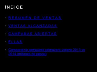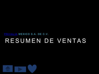 El resumen resume las ventas alcanzadas por Privialia México S.A. de C.V. en el semestre primavera-verano de 2014. A pesar de la recesión económica, lograron alcanzar 339 millones de pesos en ventas, aunque es menor a los 402 millones del año anterior. La campaña Ellas representó casi la mitad de las ventas del semestre. Las ventas fueron mayores en enero, febrero y marzo en comparación con el mismo periodo del año pasado.