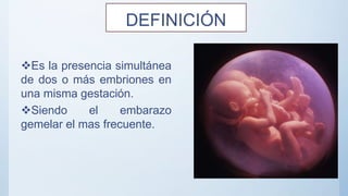 El documento aborda el embarazo múltiple, definiéndolo como la presencia de dos o más embriones en una gestación, siendo el embarazo gemelar el más común. Se discuten aspectos epidemiológicos, tipos de gestación (monocigóticos y dicigóticos), riesgos asociados, diagnóstico y consideraciones para el parto, destacando que las gestaciones múltiples conllevan mayores complicaciones tanto para la madre como para los neonatos. Además, se analizan factores de riesgo, prevención de complicaciones y pautas para el manejo del parto en estos casos.