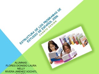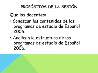 El documento presenta información sobre una sesión de capacitación para docentes. El objetivo es que los docentes conozcan y analicen los contenidos y estructura de los programas de estudio de Español 2006, y participen en actividades como analizar prácticas sociales del lenguaje y cómo enseñarlas a los estudiantes.