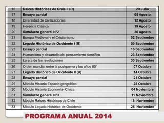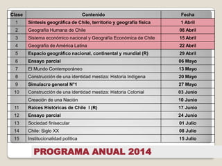 El documento presenta el programa anual de un curso de geografía de América Latina. Incluye los temas a estudiar divididos en clases con sus respectivas fechas, así como los aprendizajes esperados y ejemplos de posibles temáticas que podrían caer en la PSU. Los temas abarcan aspectos físicos, demográficos y económicos de la región.