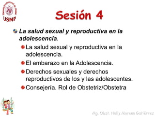 Este documento trata sobre la salud sexual y reproductiva de los adolescentes. Aborda temas como el embarazo en la adolescencia, los derechos sexuales y reproductivos, y el rol de los profesionales de la salud. Explica que la adolescencia es una etapa de transición entre la infancia y la adultez marcada por cambios físicos, emocionales y de identidad. También analiza factores como la autonomía creciente, la sexualidad emergente y los riesgos de embarazos no deseados o infecciones de transmis