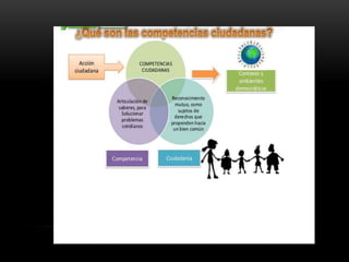 Este documento describe las competencias ciudadanas y cómo se pueden desarrollar en la escuela a través de un enfoque transversal. Explica que las competencias ciudadanas incluyen habilidades emocionales, comunicativas e integradoras. También destaca la importancia de abordar la formación cívica mediante proyectos que involucren a todas las asignaturas y analicen temas socialmente relevantes para promover la reflexión ética. Finalmente, señala que las competencias ciudadanas se pueden cultivar a través de experiencias en el aula