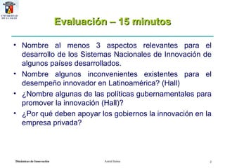 Tres aspectos relevantes para el desarrollo de los Sistemas Nacionales de Innovación de países desarrollados son: 1) las universidades que forman recursos humanos y realizan investigación, 2) las empresas que realizan investigación y desarrollo, y 3) el apoyo del gobierno a través de financiamiento e incentivos. Algunos inconvenientes para la innovación en América Latina incluyen la falta de coordinación entre universidades y empresas, y que la mayoría de investigadores trabajan en el sector público en vez del privado. Las políticas gubernament