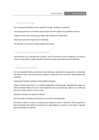 El grupo discute el problema 3 de estructuras. Deciden que la vigueta se calculará como biapoyada. Quedan pendientes de aprender o recordar el programa CYPE y plantear el cálculo de la segunda parte del problema, un pórtico, en la próxima sesión. Todos los miembros deben actualizarse en CYPE y contribuir al planteamiento del pórtico.