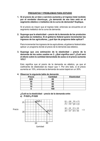 Este documento contiene 10 preguntas y problemas sobre microeconomía relacionados con conceptos como curva de demanda, elasticidad precio de la demanda, y efectos de cambios de precio en el ingreso total. Las preguntas abarcan temas como identificar si una demanda es elástica o inelástica dependiendo de si el ingreso total aumenta o disminuye con cambios de precio, calcular elasticidades precio a partir de tablas de oferta y demanda, y analizar cómo programas gubernamentales podrían afectar los ingresos de