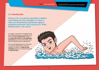 La Dieta Mediterránea se basa en el consumo abundante de alimentos vegetales, moderado de pescados, huevos y lácteos, y menor de carnes. También promueve un estilo de vida activo. Se describen otras dietas como la latinoamericana rica en vegetales, la anglosajona con carnes y pescados, y la oriental centrada en arroz, verduras y pescado. El documento explica los beneficios de la Dieta Mediterránea y características de otras dietas mundiales.
