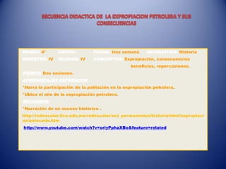 Este documento presenta una secuencia didáctica para enseñar sobre la expropiación petrolera mexicana de 1938 a través de un enfoque de situación problema. La lección se centra en explicar la participación pública en la expropiación y ubicar el año en que ocurrió. Los estudiantes investigarán conceptos clave, analizarán textos y videos, y entrevistarán a personas mayores para comprender las consecuencias de la expropiación.