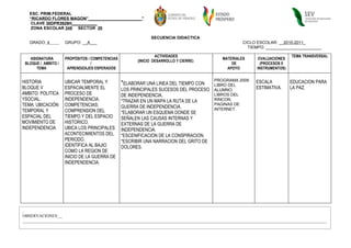 Este documento presenta una secuencia didáctica para la asignatura de historia en el cuarto grado de primaria. La secuencia se centra en ubicar temporal y espacialmente el proceso de independencia de México y cubrirá temas como elaborar una línea de tiempo de los principales sucesos de la independencia, trazar en un mapa la ruta de la guerra de independencia, y elaborar un esquema de las causas internas y externas de la guerra de independencia. Las actividades se evaluarán utilizando una escala estimativa y se alinear