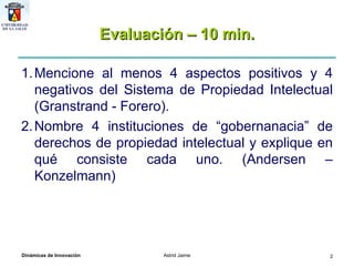 El documento presenta información sobre el sistema de propiedad intelectual (PI) y su relación con el desarrollo económico. Explica que un sistema de PI efectivo puede promover la innovación y el crecimiento al proteger el capital intelectual de una nación. También discute los diferentes mecanismos de PI como patentes, secretos comerciales y marcas, e instituciones como la Organización Mundial de la Propiedad Intelectual (OMPI) que gobiernan los derechos de PI a nivel internacional. Finalmente, analiza los antecedentes histó