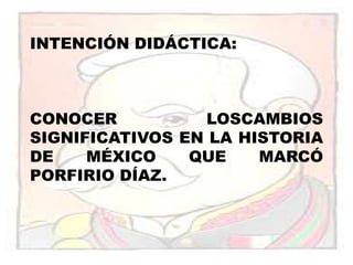 Este documento presenta un plan de actividades para una clase de historia sobre el Porfiriato en México. Los estudiantes aprenderán sobre los cambios significativos durante el gobierno de Porfirio Díaz a través de discusiones, entrevistas de personajes históricos, cuadros comparativos, líneas de tiempo y búsquedas en internet. El objetivo es que identifiquen hechos importantes del Porfiriato y conozcan sus ventajas y desventajas.