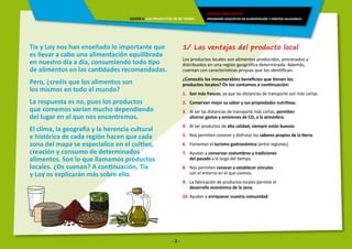 El documento presenta información sobre los productos locales y de temporada. Explica que los alimentos disponibles varían según la región debido al clima y la cultura. Detalla las ventajas de los productos locales como su frescura y aporte a la economía local. También describe las denominaciones de origen y productos de temporada, notando que estos ofrecen un mayor valor nutricional. El objetivo es promover una alimentación basada en los alimentos propios del territorio.