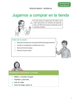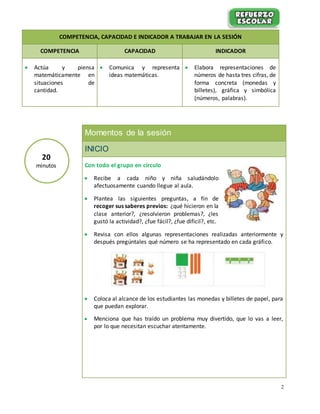 Este documento describe una lección para tercer grado sobre representar números de hasta tres cifras usando monedas y billetes. Los estudiantes jugarán a comprar en una tienda y resolverán un problema donde deben ayudar a Julia a pagar por dos artefactos sin recibir cambio. Primero explorarán las representaciones numéricas y luego trabajarán en equipos para escoger los billetes y monedas necesarios para pagar cada artículo y el total. Al final reflexionarán sobre lo aprendido.