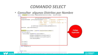 El documento presenta una sesión sobre introducción a la manipulación de datos en bases de datos, incluyendo consideraciones para insertar, actualizar y eliminar registros usando Java Database Connectivity. También introduce el comando SQL SELECT para recuperar registros.