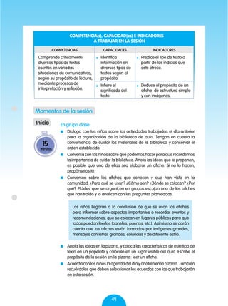 Este documento presenta una sesión de lectura sobre afiches. La sesión comienza con una discusión sobre la función de los afiches y un análisis de ejemplos traídos por los estudiantes. Luego, los estudiantes leen e interpretan un afiche específico en su libro de trabajo, identificando detalles como la fecha del evento anunciado. Finalmente, reflexionan sobre cómo los diferentes elementos en el afiche ayudaron a determinar su propósito.