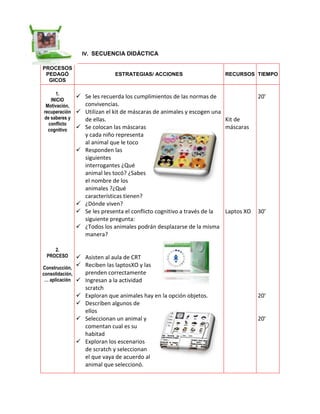 La sesión de aprendizaje con Scratch tuvo como objetivo que los estudiantes aprendan a describir las características de los animales. Primero, los estudiantes usaron máscaras de animales para representarlos y describir sus características físicas y hábitats. Luego, usaron Scratch para explorar y seleccionar animales, escenarios y programar sus movimientos. Finalmente, los estudiantes investigaron en libros y internet sobre las características de los animales de su región y elaboraron máscaras y fichas sobre ellos.