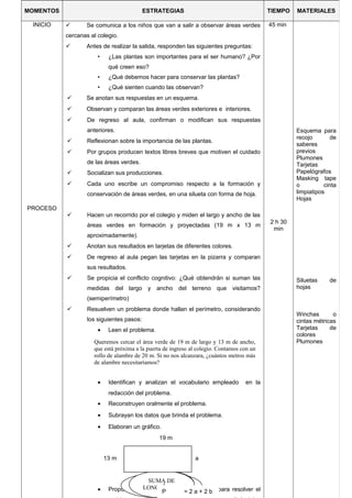 Este documento describe una sesión de aprendizaje sobre perímetros. Los estudiantes salieron a observar áreas verdes y midieron sus dimensiones. Luego, resolvieron problemas que implicaban calcular perímetros de polígonos, como un rectángulo de 19 m de largo y 13 m de ancho. Finalmente, completaron actividades para evaluar su comprensión de los perímetros.