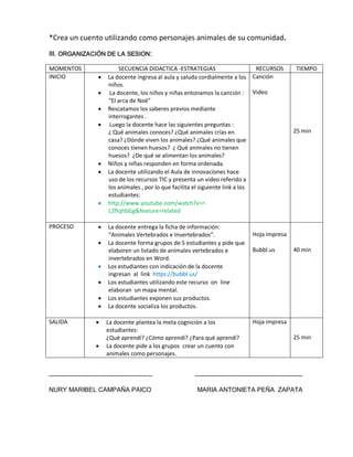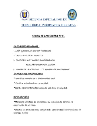 Este documento presenta la sesión de aprendizaje número 01 sobre los animales de la comunidad para el grado quinto "A". La sesión consta de tres momentos: inicio, proceso y salida. En el inicio, los estudiantes comparten sus conocimientos previos sobre animales y ven un video. En el proceso, elaboran una lista de animales vertebrados e invertebrados y un mapa mental utilizando recursos TIC. En la salida, reflexionan sobre su aprendizaje y crean cuentos con animales como personajes.
