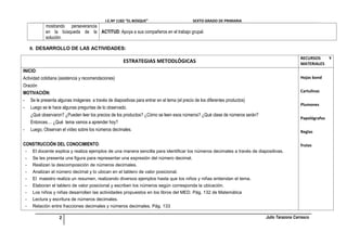 Este documento describe una sesión de aprendizaje sobre números decimales para el sexto grado de primaria en la I.E. No 1182 "El Bosque". La sesión incluye motivación del tema, construcción del conocimiento a través de explicaciones y ejemplos, y aplicación del conocimiento resolviendo ejercicios. Los estudiantes aprenden a identificar, leer, escribir y realizar operaciones con números decimales.