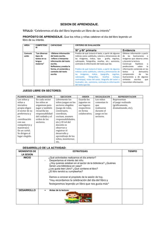 El documento describe una sesión de aprendizaje para celebrar el día del libro en el que los niños leerán un libro de su interés. La sesión incluirá una discusión sobre libros y lectura, la lectura en grupo de un cuento seleccionado, y un dibujo de la parte favorita del cuento. El propósito es que los niños disfruten de la lectura y festejen el día del libro.