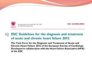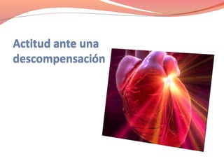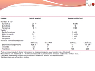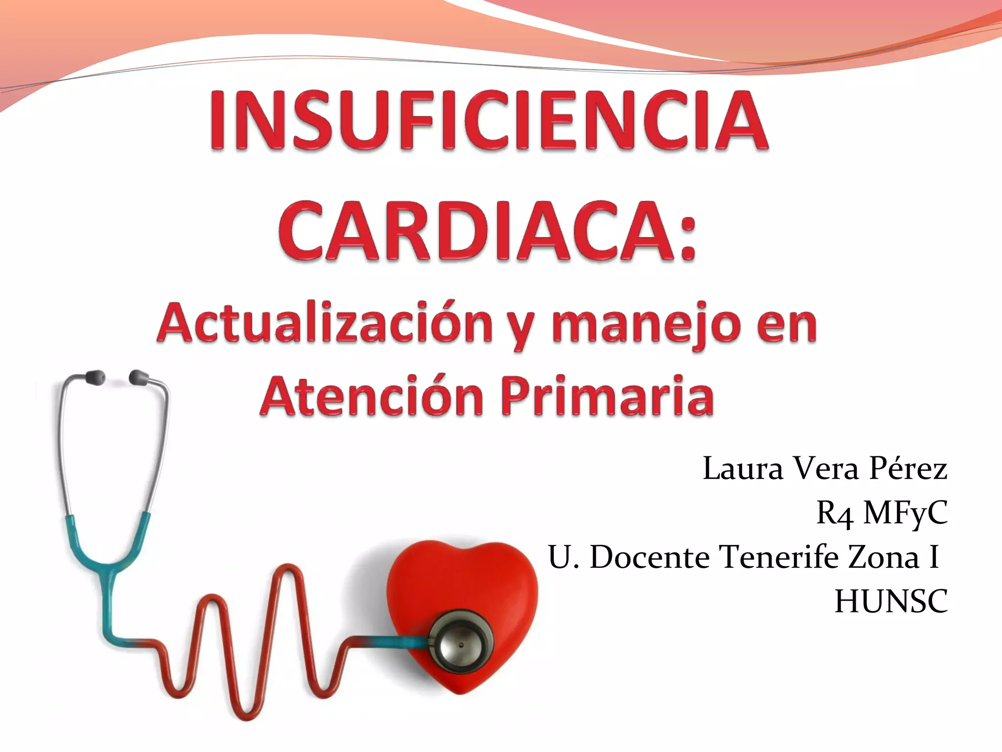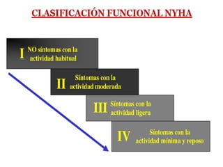 El documento describe la insuficiencia cardíaca, definiéndola como una anormalidad estructural o funcional del corazón que conduce a la insuficiencia para suministrar oxígeno a los tejidos a pesar de las presiones normales de llenado. Describe los síntomas, signos y evidencias objetivas de insuficiencia cardíaca, así como su clasificación, etiología, diagnóstico, fracción de eyección deprimida y preservada, objetivos de tratamiento, medidas higiénico-dietéticas y farmacoterapia.